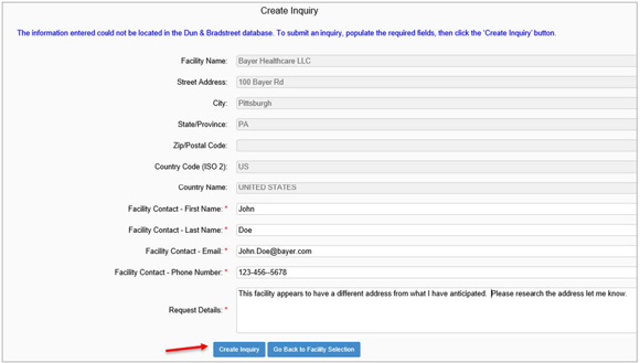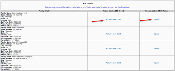 您的查询可能会导致一个或多个公司出现在您的“设施列表”页面。仔细查看查询结果后,选择您知道正确的公司名称和地址。
