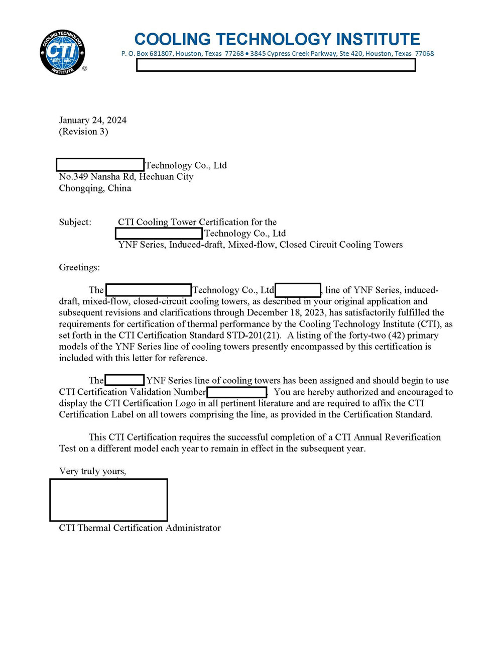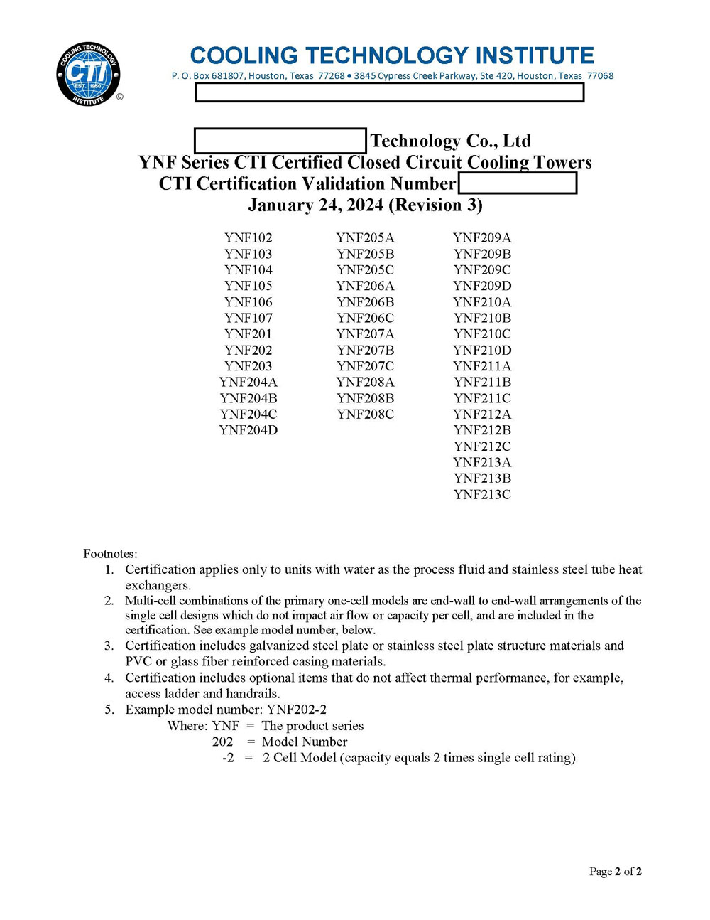 冷却塔CTI认证是针对冷却塔一个系列的认证,在一份证书上将体现一个系列的所有型号,依据STD-201认证程序,CTI认证要求每一年度都要进行冷却塔年度例行测试以验证发布的水流量的准确性,因此CTI认证证书的有效期是一年,以下是CTI认证的证书样式: